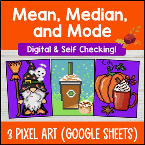 Buy on TPT →This digital pixel art resource helps your 6th or 7th graders practice mean, median, and mode with 3 autumn-themed Google Sheets activities perfect for fall, Halloween, and Thanksgiving. It’s self-checking and provides instant feedback, making review and independent practice easy and engaging. It aligns with CCSS standards 6.SP.A.3 and 7.SP.B.4 and is great for sub plans, extensions, or extra credit—all ready to assign online with no prep needed.