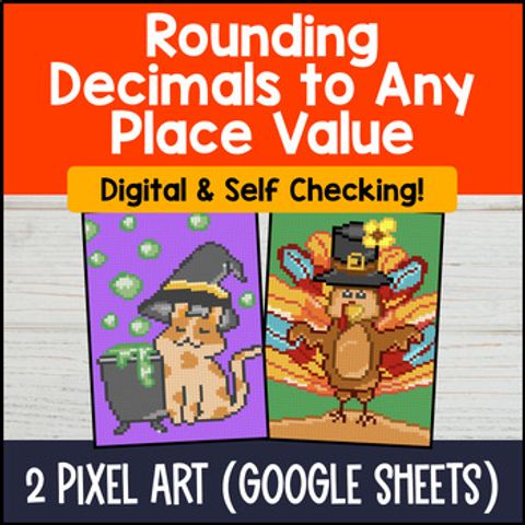 Buy on TPT →Get your students excited about rounding decimals with this engaging Fall-themed Digital Pixel Art resource for 5th grade! Featuring two Google Sheets with a total of 36 questions, they'll practice rounding decimals to the hundredths and thousandths place while they unlock autumn images. This self-checking tool not only provides instant feedback—incorrect answers show up in red, and correct ones in green—but also keeps them engaged and focused. Aligned with CCSS 5.NBT.A.4, it's perfect for review lessons, sub plans, or independent practice during Halloween and Thanksgiving!