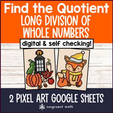 Buy on TPT →Students practice finding the quotient of whole numbers with 3 and 4 digits through long division with this Long Division of Whole Numbers Digital Pixel Art resource. Contains 2 pixel art Google Sheets with 24 problems total. Level 1 involves long division of whole numbers with 3 digit dividend. Level 2 involves long division of whole numbers with 4 digit dividend. Images are autumn themed, perfect for fall, back to school, Halloween, and Thanksgiving. It's great for sub plans, review lessons, extra credit, extensions, and independent practice!